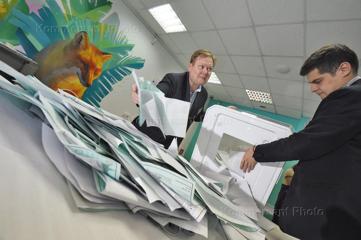 Единый день голосования по выбору депутатов Государственной думы России и в местные органы власти. Подсчет результатов голосования на избирательном участке № 39 на улице Бахрушина.