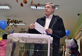 Выборы депутатов Государственной Думы VII созыва. Голосование. Председатель федерального политкомитета партии "Яблоко" Григорий Явлинский на избирательном участке № 2579.