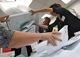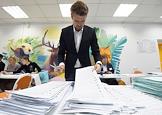 Выборы депутатов Государственной думы России VII созыва. Голосование. Член избирательной комиссии избирательного участка № 39 на улице Бахрушина после окончания голосования во время гашения неиспользованных избирательных бюллетеней.