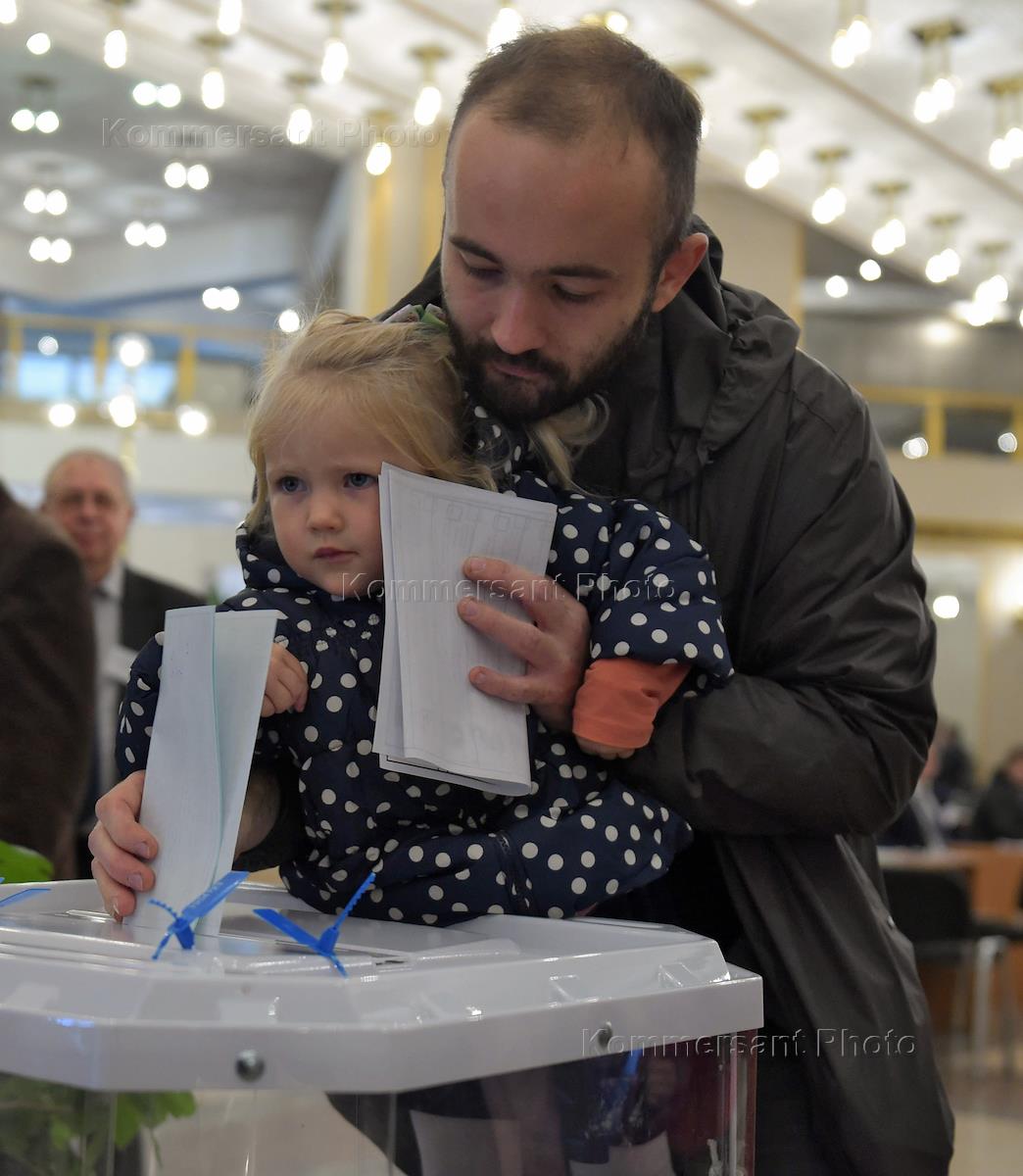 Выборы депутатов Государственной думы VII созыва. Голосование. Маленькая девочка около кабинки для избирателей на избирательном участке.