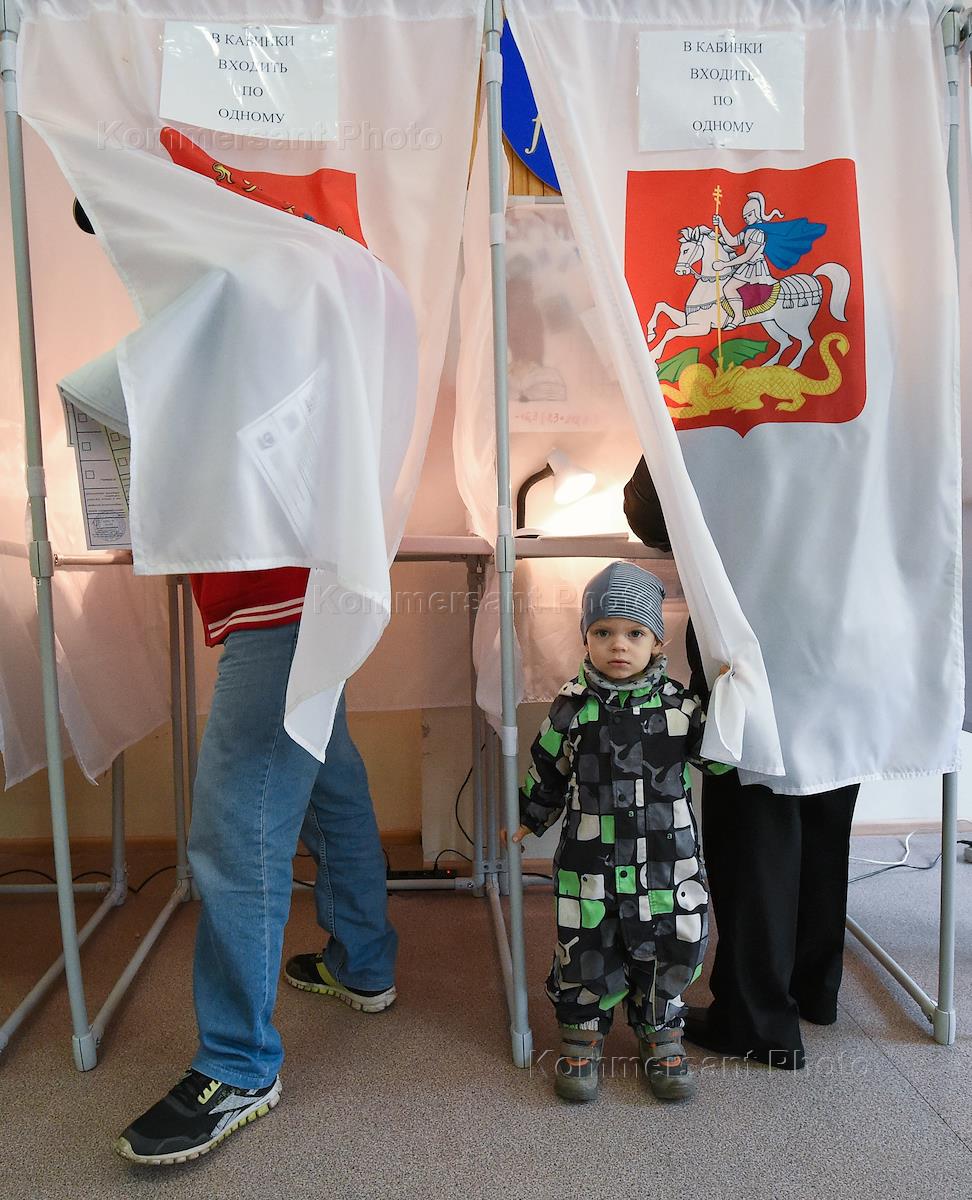Выборы депутатов Государственной думы VII созыва. Голосование. Избирательница с ребенком на избирательном участке.
