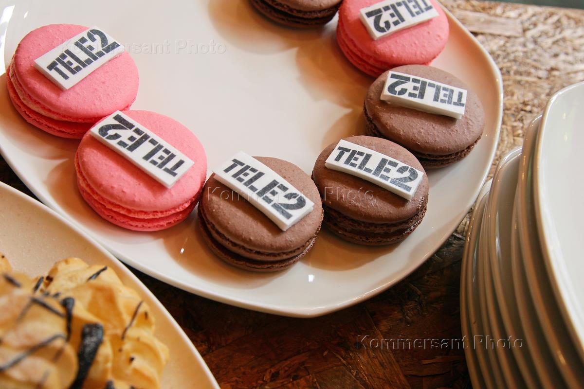 Презентация новой сети четвертого поколения 4G компании Tele2. Пирожные с логотипом компании перед презентацией .