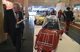 Открытие выставочного проекта "Российский Форум коллекционеров" в Центральном Доме Художника (ЦДХ). Посетители выставки у стенда с ретро-автомобилями.