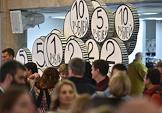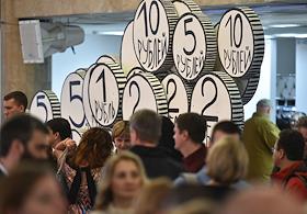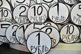 Открытие выставочного проекта "Российский Форум коллекционеров" в Центральном Доме Художника (ЦДХ). Стилизованные монеты как инсталляция у стенда нумизматики.