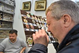 Открытие выставочного проекта "Российский Форум коллекционеров" в Центральном Доме Художника (ЦДХ). Участник форума на стенде фалеристики (коллекционирование значков).