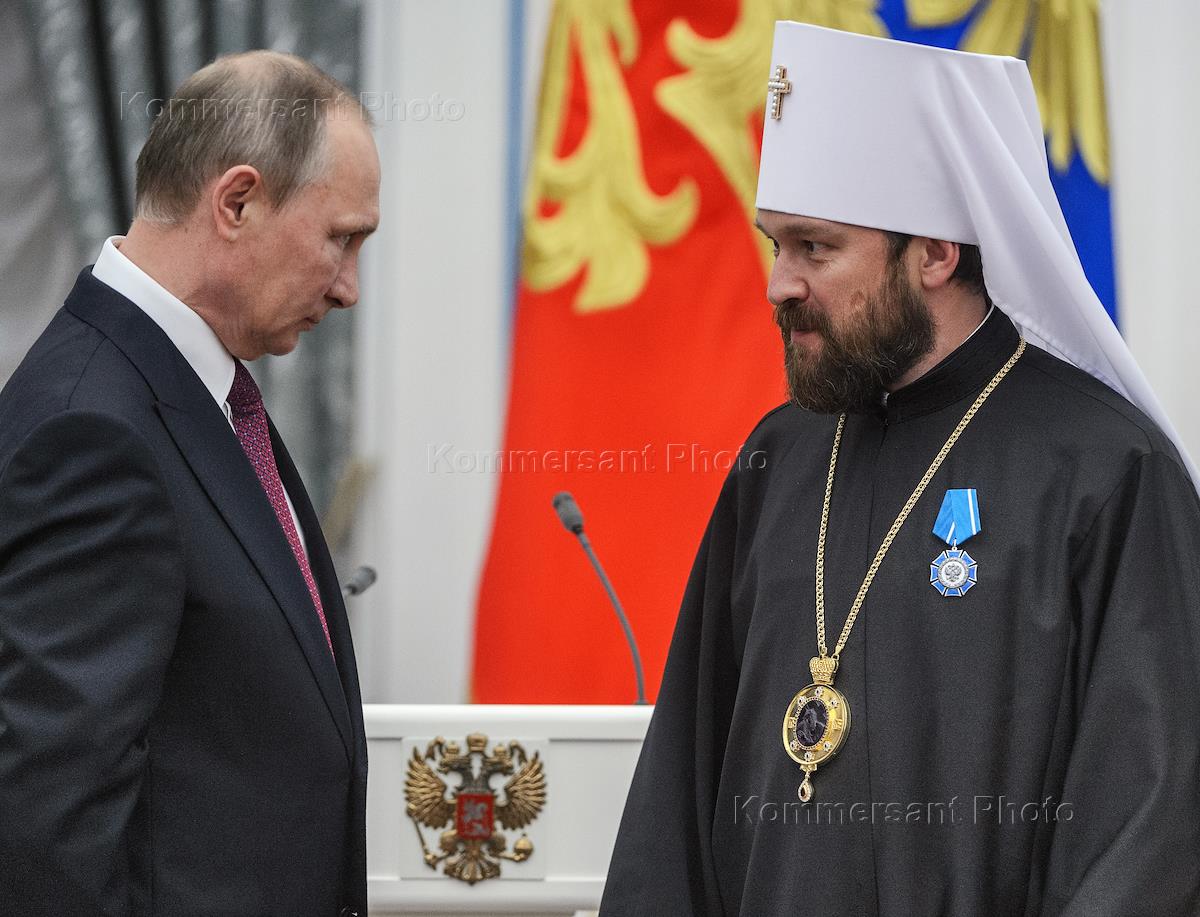 Церемония вручения государственных наград России за выдающиеся достижения. Президент России Владимир Путин (слева) и председатель Отдела внешних церковных связей Московского патриархата, митрополит Волоколамский Илларион (справа) на церемонии в Екатерининском зале Кремля.