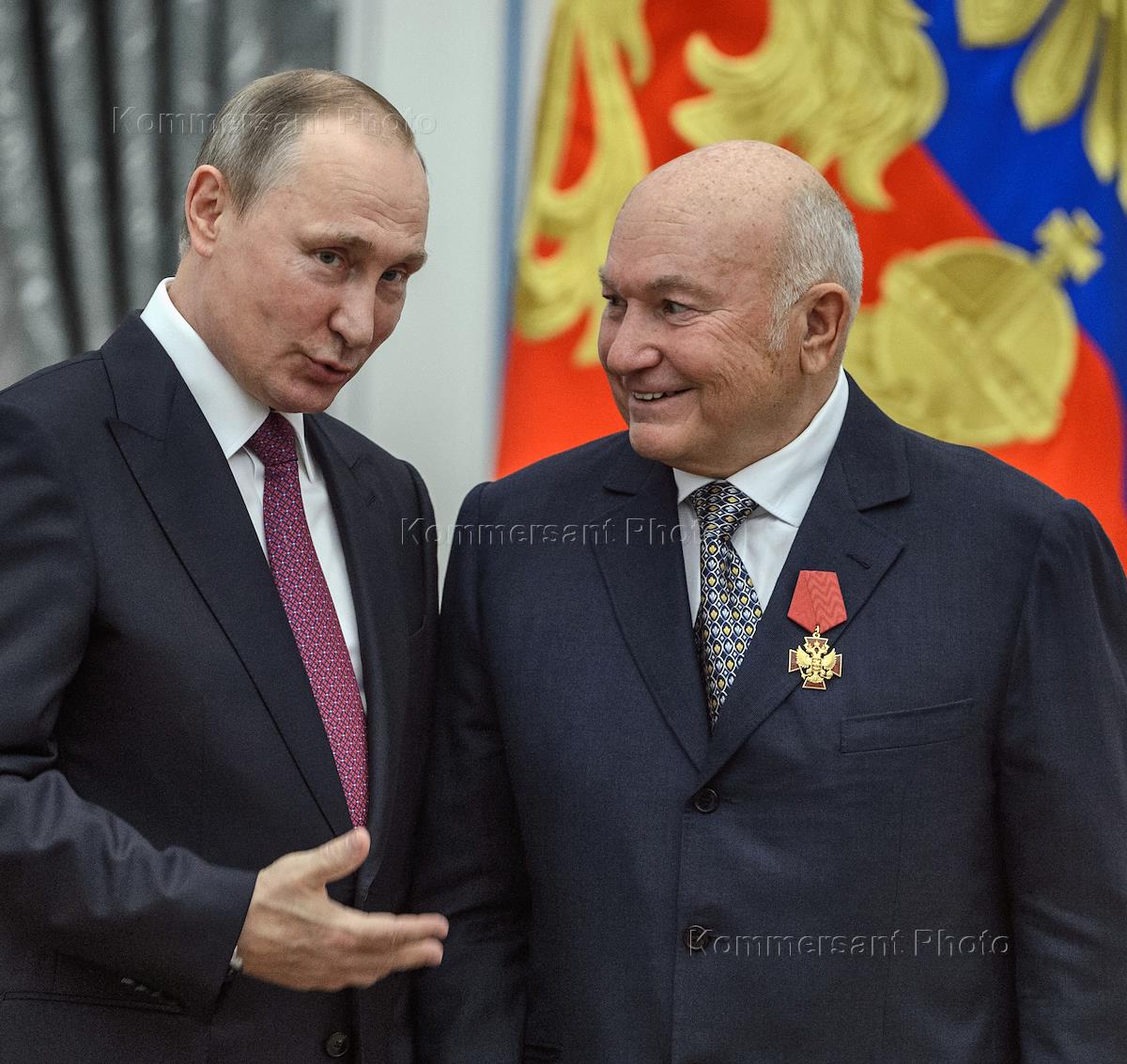 Церемония вручения государственных наград России за выдающиеся достижения. Бывший мэр Москвы Юрий Лужков (слева) и президент России Владимир Путин (справа) на церемонии в Екатерининском зале Кремля.