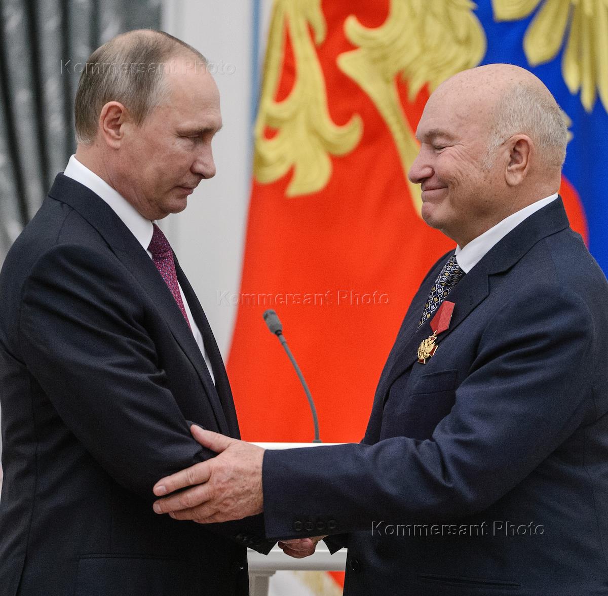 President Vladimir Putin (left) awards ex-mayor of Moscow Yuri Luzhkov (right) during the ceremony of giving state decorations in the Kremlin.