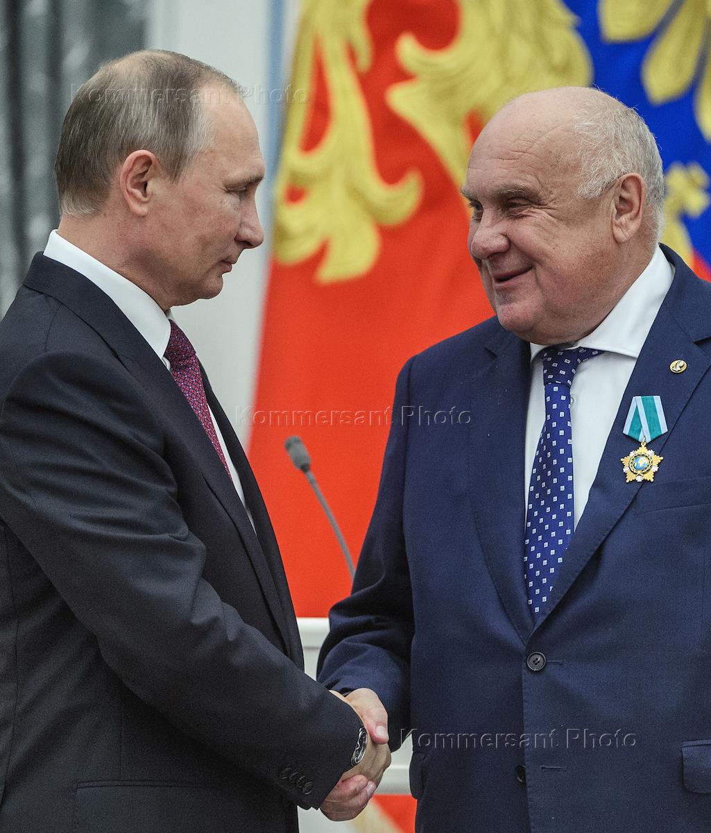 Церемония вручения государственных наград России за выдающиеся достижения. Президент России Владимир Путин (слева) и художественный руководитель Санкт-Петербургского Дома музыки Сергей Ролдугин (справа) на церемонии в Екатерининском зале Кремля.