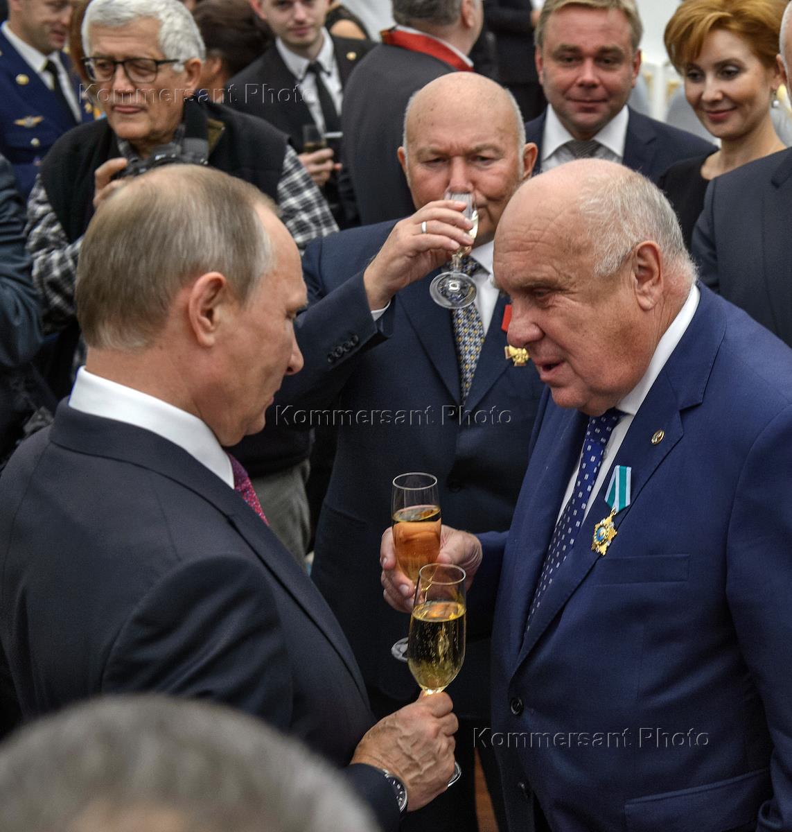 President Vladimir Putin (left) awards ex-mayor of Moscow Yuri Luzhkov (right) during the ceremony of giving state decorations in the Kremlin.