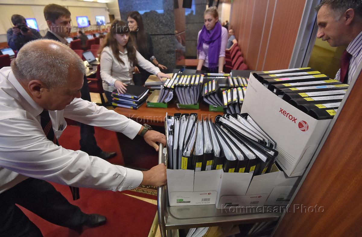 Заседание Центральной избирательной комиссии Российской Федерации по утверждению резульатов голосования россиян, полученных после подсчета 100% протоколов избирательных комиссий во всех регионах нашей страны. Слева направо: член Центральной Избирательной Комиссии (ЦИК) России Василий Лихачев, заместитель председателя ЦИК Николай Булаев и член ЦИК Сиябшах Шапиев во время осмотра избирательных протоколов.