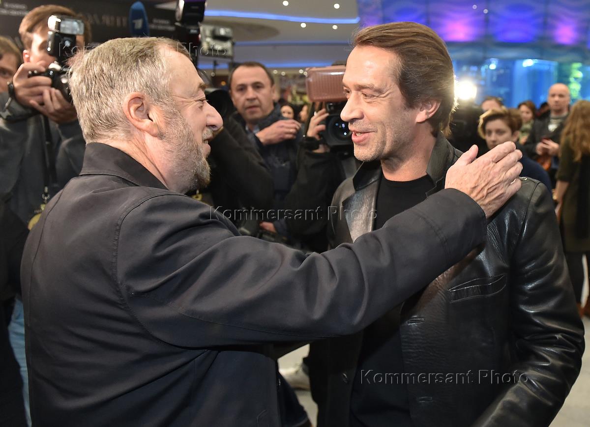 Режиссер Павел Лунгин (слева) и актер Владимир Машков (справа) на премьере фильма "ДУЭЛЯНТ" режиссера Алексея Мизгирева, в кинотеатре "Формула Кино на Кутузовском".
