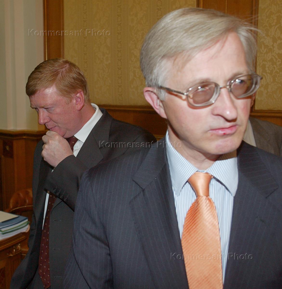 Председатель правления РАО "ЕЭС России" Анатолий Чубайс (слева) и председатель наблюдательного совета инвестиционной группы "Ренессанс Капитал" Александр Шохин (справа) на очередном заседании Правительства России.