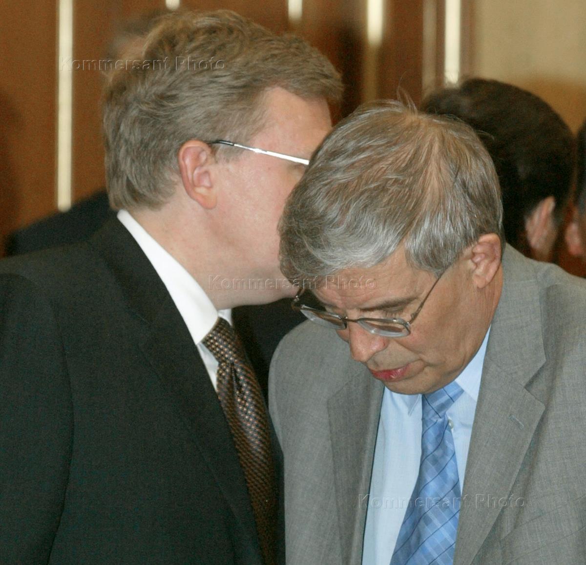 Russian Deputy Prime Minister, Finance Minister Alexey Kudrin (left) talks to the chairman of the Central Bank Sergey Ignatyev (right) during a government meeting.