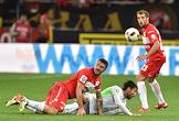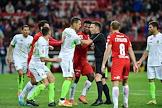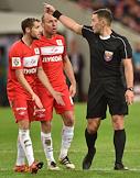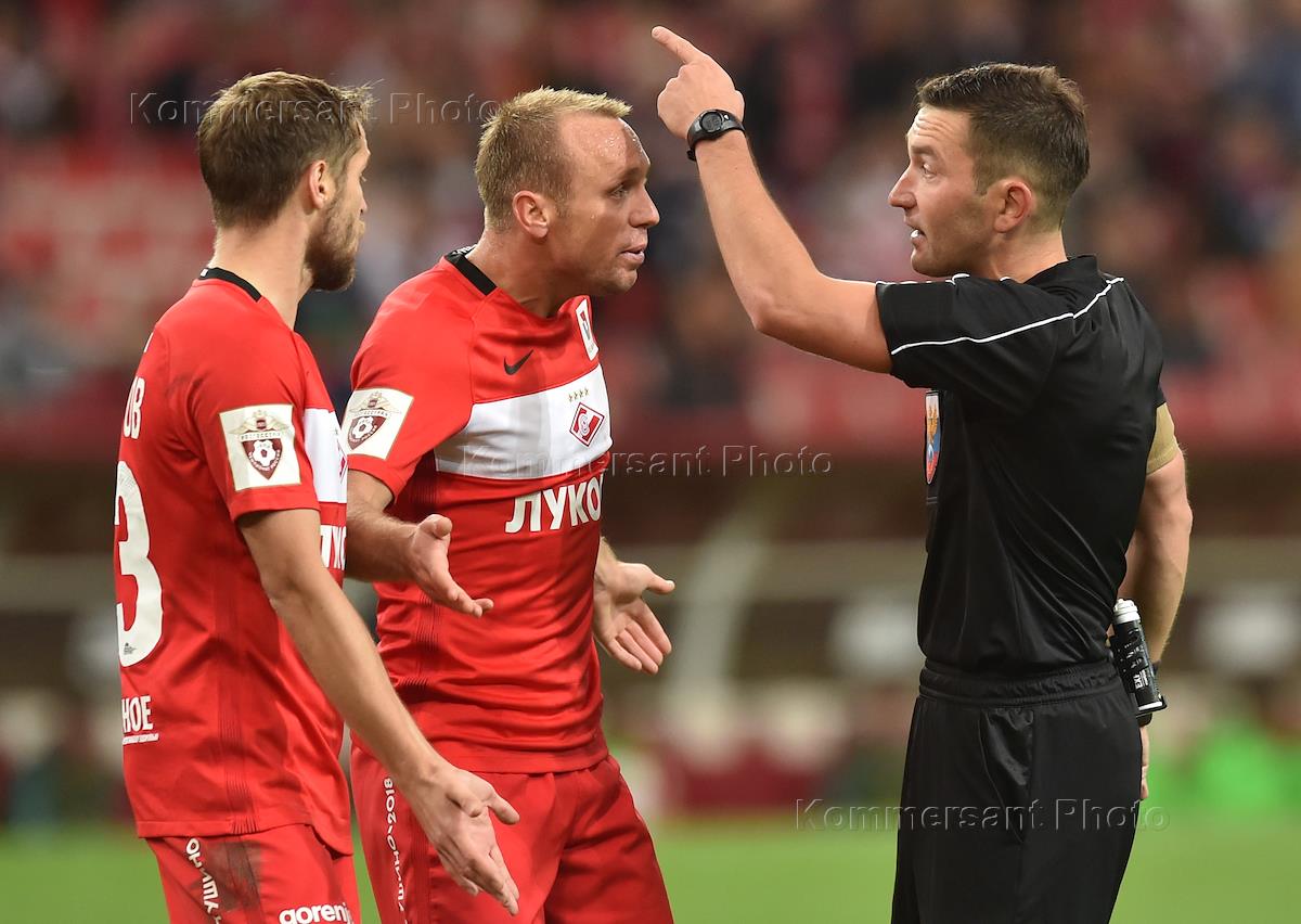 Футбол. Чемпионат России по футболу среди клубов Премьер-лиги. 8-ой тур. Матч между командами "Спартак" (Москва) и "УФА" (Москва) прошел на стадионе Открытие Арена. Игроки "Спартака" Дмитрий Комбаров (слева), Денис Глушаков (в центре) и главный судья матча Роман Галимов (справа) во время матча.