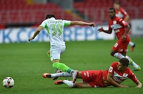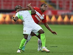 Чемпионат России по футболу среди клубов Премьер-лиги. 8-ой тур. Матч между командами "Спартак" (Москва) и "Уфа" (Уфа) на стадионе Открытие Арена. Игрок команды "Уфа" Александр Сухов (слева) и футболист команды "Спартак" Квинси Промес (справа) во время матча.