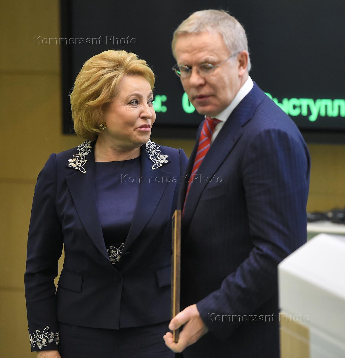 Federation Council Speaker Valentina Matviyenko (left) and first deputy chairman of the Federation's Council Committee of Social Policy Vyacheslav Fetisov (right) attend Federation Council meeting.