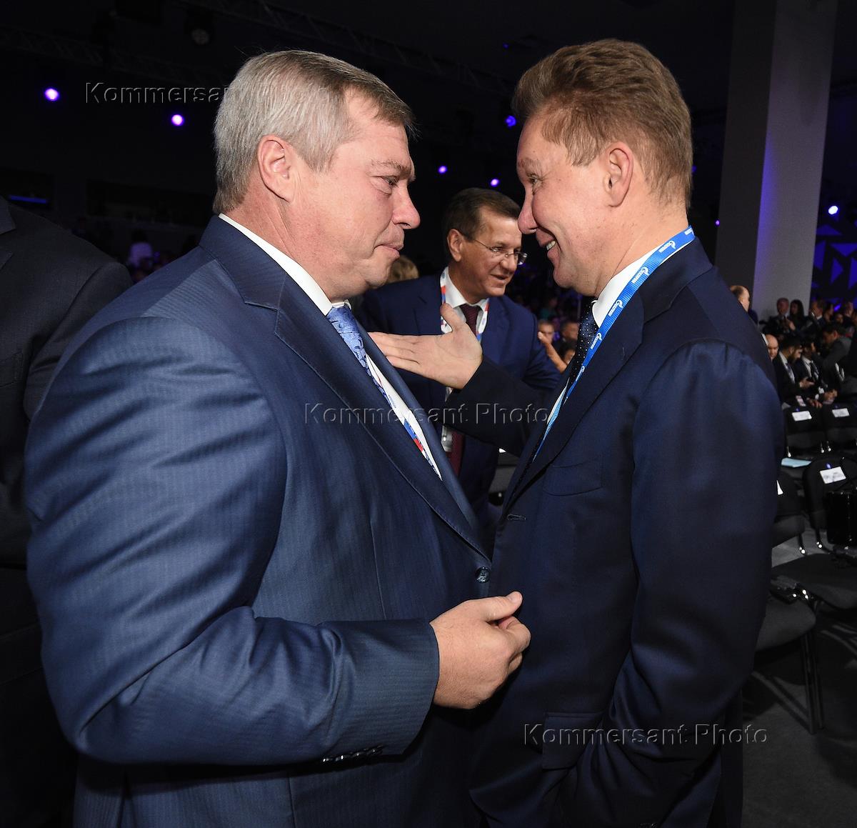 XV Международный Инвестиционный форум "Сочи-2016". День второй. Губернатор Ростовской области Василий Голубев (слева) и председатель правления ПАО "Газпром" Алексей Миллер (в центре) на пленарном заседании "Новое качество государственного управления: проекты для роста, проекты для жизни" в главном медиацентре на территории Олимпийского парка.