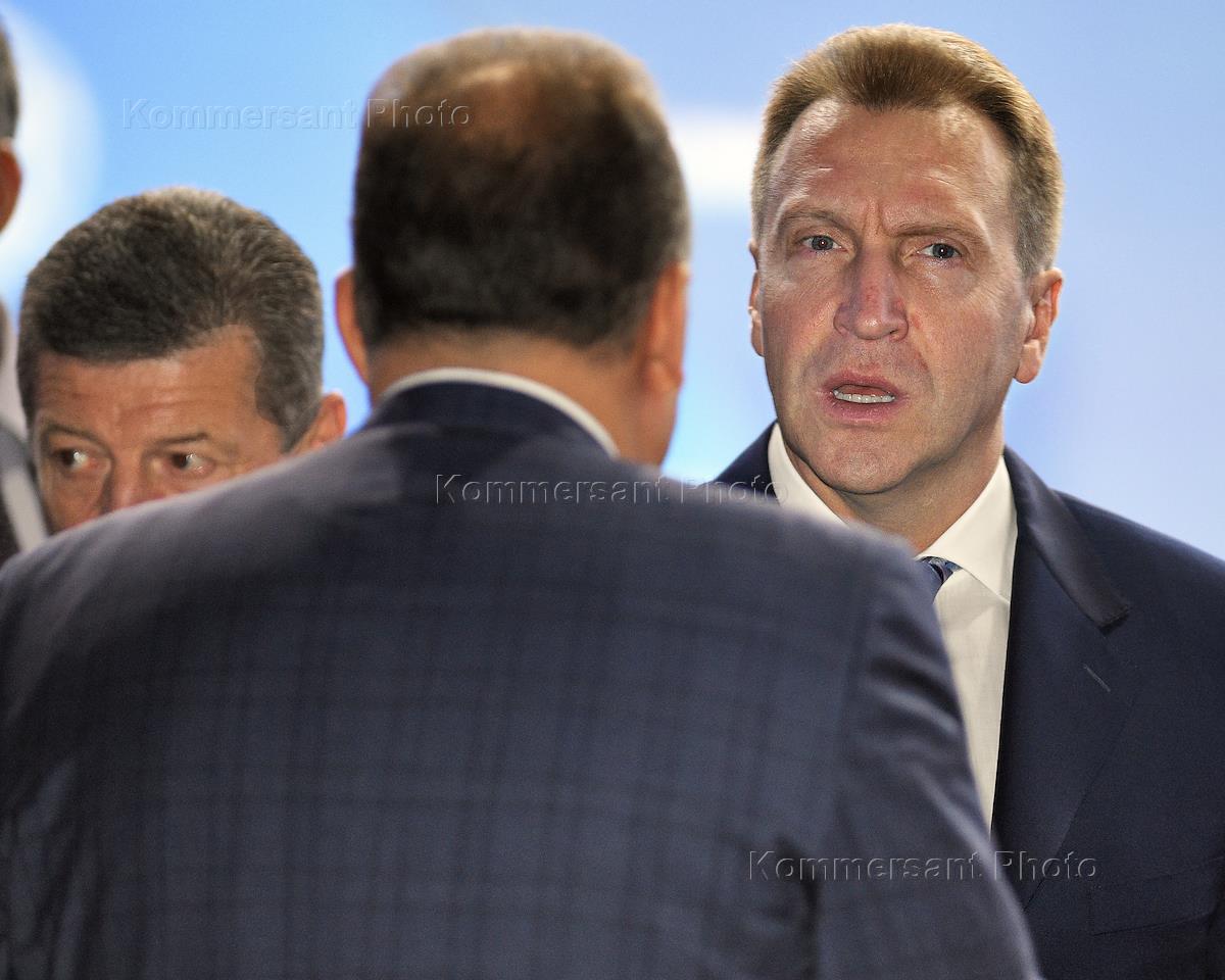 XV Международный Инвестиционный форум "Сочи-2016". День второй. Заместители председателя Правительства России Дмитрий Козак (слева) и первый заместитель председателя правительства России Игорь Шувалов (справа) на пленарном заседании "Новое качество государственного управления: проекты для роста, проекты для жизни" в главном медиацентре на территории Олимпийского парка.