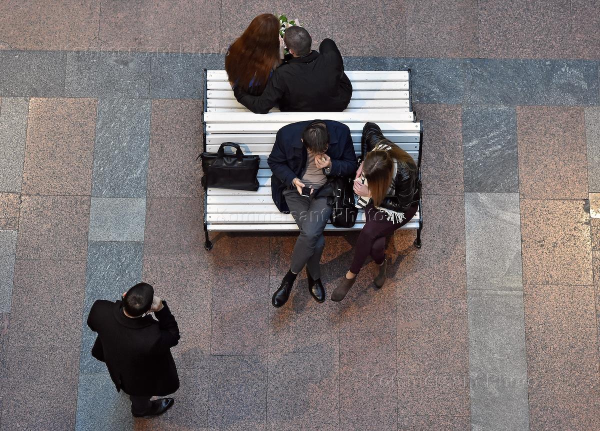 Жанровая фотография. Парочки на двойной скамейке в ГУМе.