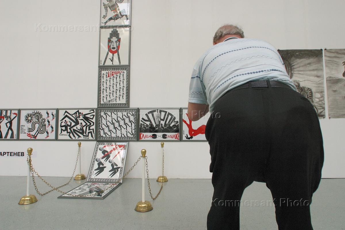 A visitor leans down to take a better look at the pictures displayed at the exhibition held in Novy Manezh Gallery to mark the 10th anniversary of the Kino Gallery.