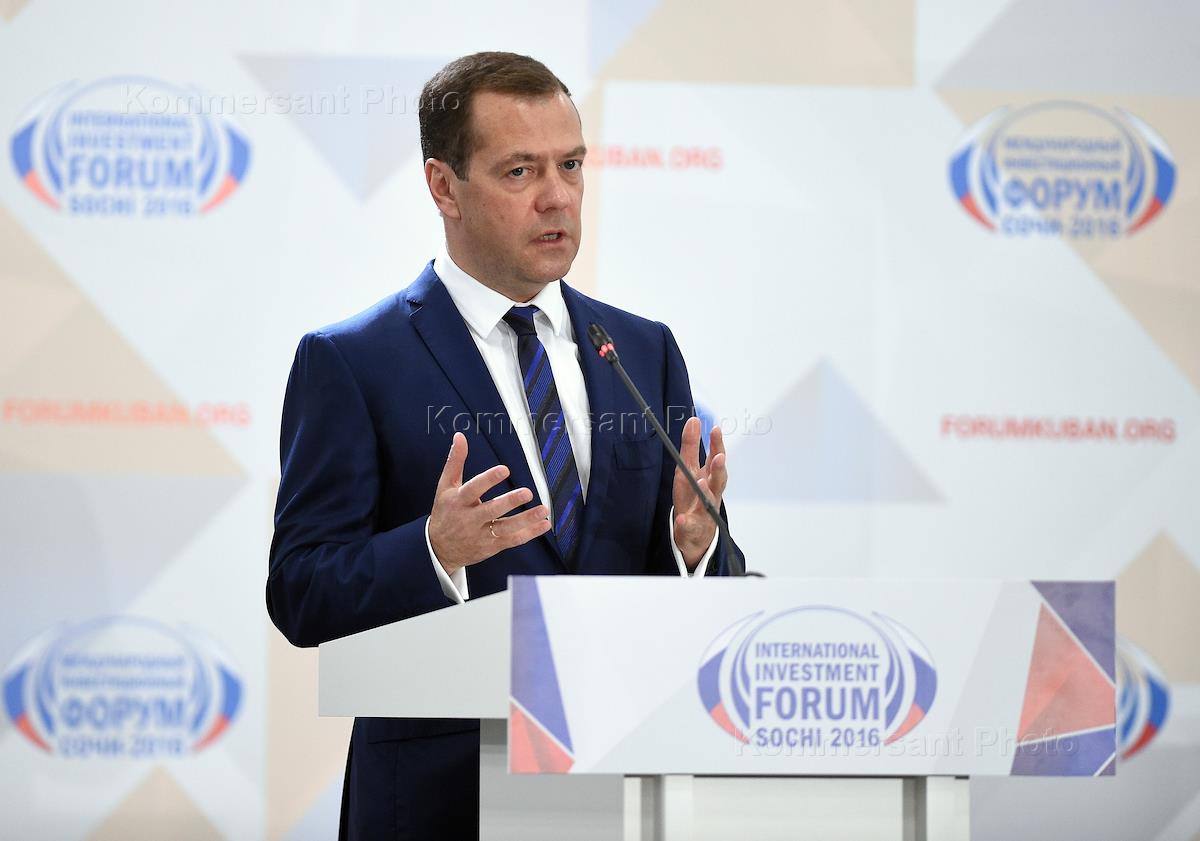 XV Международный инвестиционный форум "Сочи 2016". День третий. Председатель правительства России Дмитрий Медведев во время пленарного заседания форума.