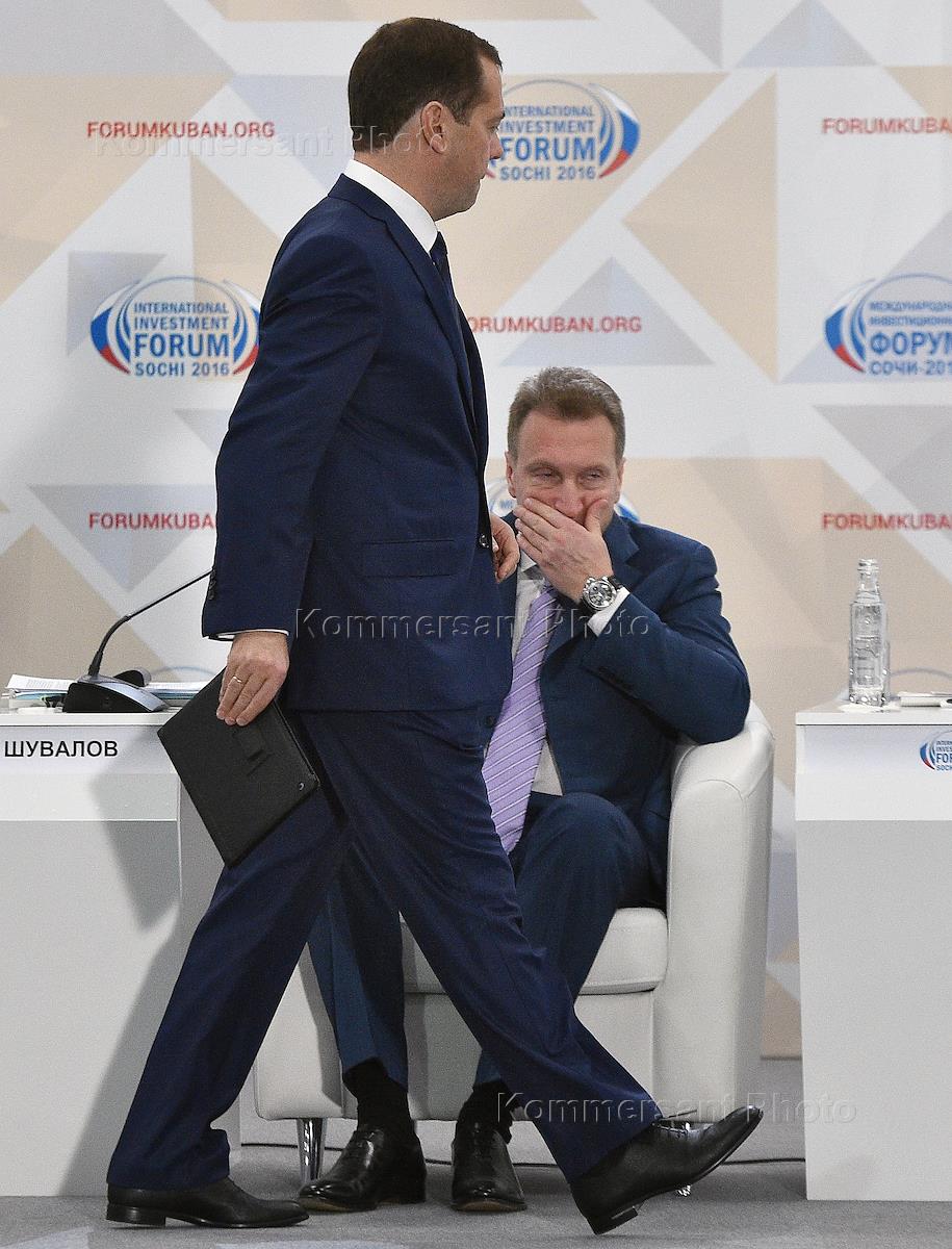 XV Международный инвестиционный форум "Сочи 2016". День третий. Pаместитель председателя правительства России Аркадий Дворкович (справа) и первый заместитель председателя правительства России Игорь Шувалов (слева) во время пленарного заседания форума.