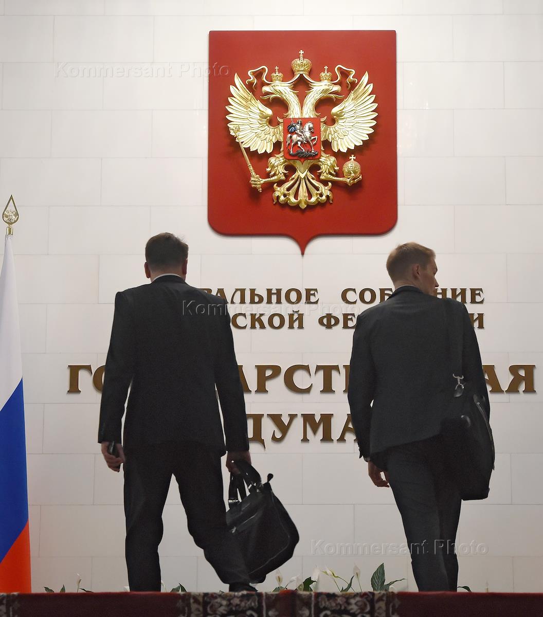 From left to right: Russian Presidential Press Secretary Dmitry Peskov, Head of the Foreign Intelligence Service (FIS) Sergei Naryshkin and Russian President Vladimir Putin attend the first meeting of the Russian State Duma of the new convocation.