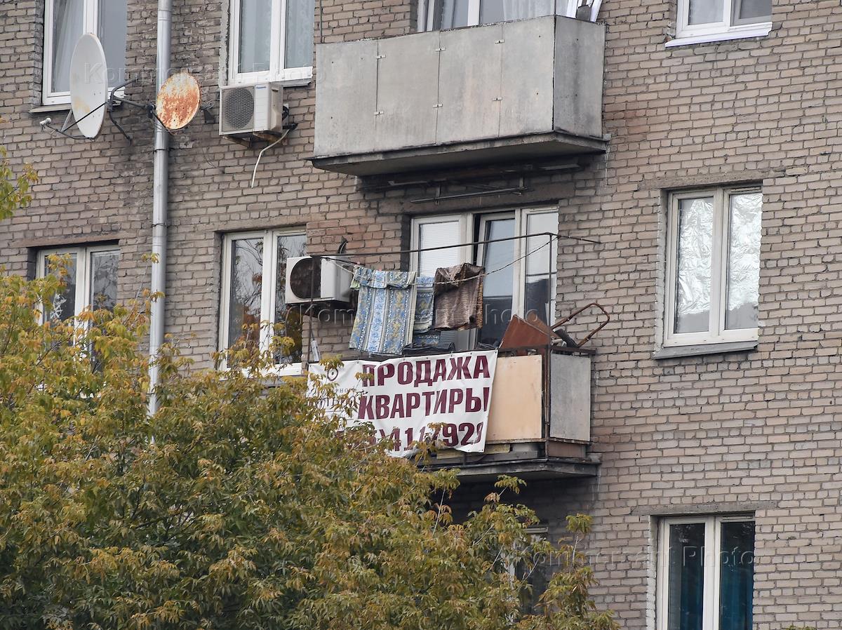 Жанровая фотография. Объявление о продажи квартиры на балконе пятиэтажного дома.