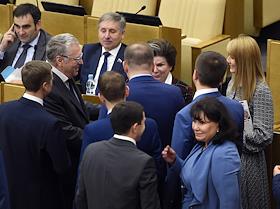 Заседание Государственной думы (ГД) России. Лидер Либерально-демократической партии России (ЛДПР), член комитета ГД России по обороне Владимир Жириновский (слева), заместитель председателя комитета ГД России по федеративному устройству и вопросам местного самоуправления Валентина Терешкова (в центре) и первый заместитель председателя комитета ГД России по международным делам Светлана Журова (справа) во время заседания.