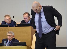 Заседание Государственной думы (ГД) России. Председатель комитета ГД России по делам национальностей Ильдар Гильмутдинов (слева) и первый заместитель председателя комитета ГД России по физической культуре, спорту, туризму и делам молодежи Вячеслав Фетисов (справа) во время заседания.