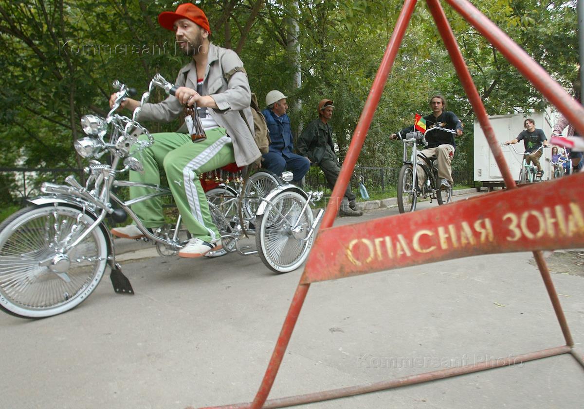 Frontman of the Leningrad rock band Sergey Shnurov rides a bicycle after the news conference summoned to announce that teh Leningrad is going to sue Gala Records company. The news conference was held in the B-2 Club.
