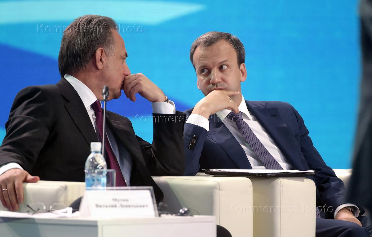 Рабочая поездка президента России Владимира Путина во Владимирскую область. Министр спорта России Виталий Мутко (слева) и заместитель председателя Правительства России Аркадий Дворкович (справа) во время VI Международного спортивного форума "Россия - спортивная держава" в Коврове.