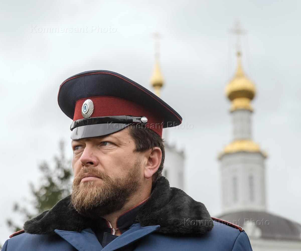 Церемония открытия памятника царю Ивану Грозному. Казак на фоне Богоявленского храма.