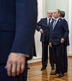 Рабочая поездка президента России Владимира Путина в Армению. Слева направо: генеральный секретарь Организации договора о коллективной безопасности (ОДКБ) Николай Бордюжа, президент Белоруссии Александр Лукашенко и премьер-министр Казахстана Бакытжан Сагинтаев перед началом церемонии совместного фотографирования глав делегаций государств-членов ОДКБ.