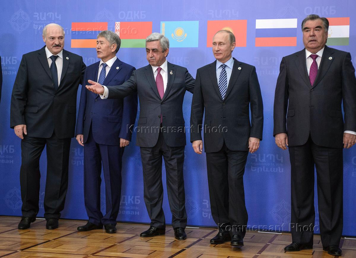 Рабочая поездка президента России Владимира Путина в Армению. Слева направо: президент Белоруссии Александр Лукашенко, президент Киргизии Алмазбек Атамбаев, президент Армении Серж Саргсян, президент России Владимир Путин и президент Таджикистана Эмомали Рахмон во время церемонии совместного фотографирования глав делегаций государств-членов ОДКБ.