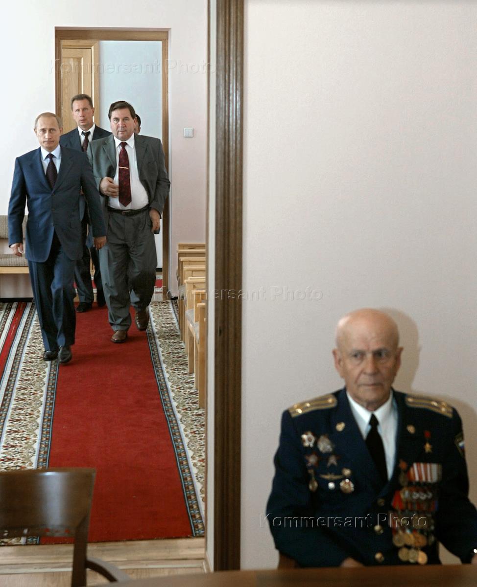Президент России Владимир Путин (слева) на встречи с ветеранами Великой Отечественной войны из Курска, Белгорода и Орла - трех регионов, на земле которых 60 лет назад состоялось величайшее сражение, вошедшее в мировую историю как битва на Курской дуге. Президент прибыл в Курск на празднование юбилея победы Красной Армии над фашистскими войсками на Курской дуге.