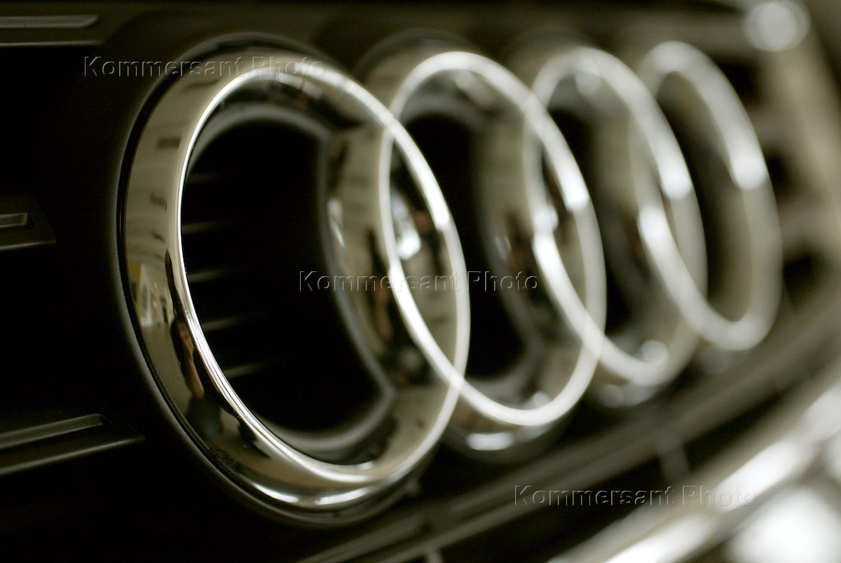 Презентация автомобиля "Audi - A 8 Long" в "Audi Центре" на Хорошевском шоссе. Передняя решетка капота и эмблема автомобильной фирмы.