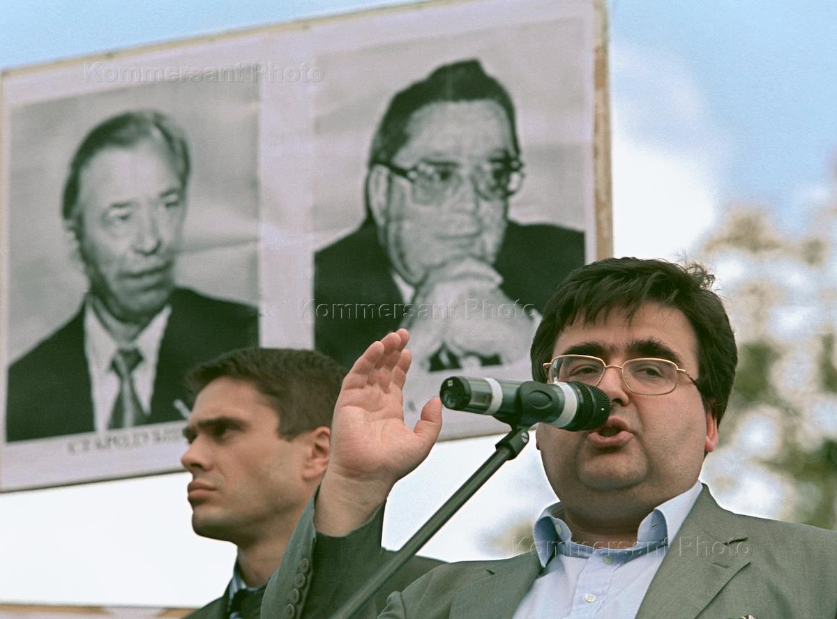 Член фракции Либерально-демократической партии России (ЛДПР), член Комитета Государственной Думы России по кредитным организациям и финансовым рынкам Алексей Митрофанов (справа) во время выступления на митинге сторонников ЛДПР, посвященном 12-й годовщине ГКЧП. Митинг прошел на Пушкинской площади.