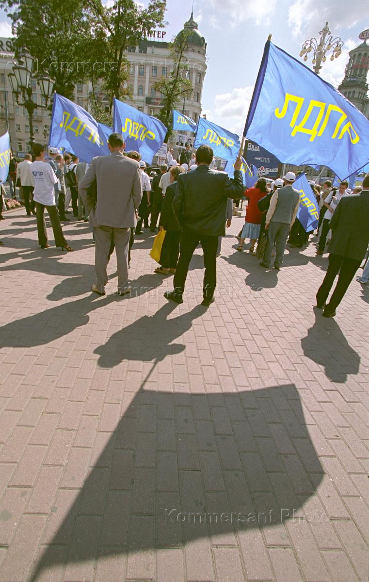 Митинг сторонников Либерально-демократической партии России (ЛДПР), посвященном 12-й годовщине ГКЧП несут флаги с логотипом ЛДПР. Митинг прошел на Пушкинской площади.