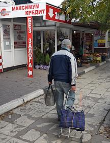 Жанровая фотография. Пожилая женщина на фоне рекламы cети магазинов мобильной связи "ПАРК" (park-mobile) "Здесь живут смартфоны".