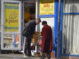 Жанровая фотография. Пенсионерка покупает мед в торговой палатке.