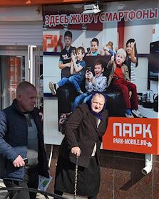 Жанровая фотография. Пожилая женщина на фоне рекламы cети магазинов мобильной связи "ПАРК" (park-mobile) "Здесь живут смартфоны".