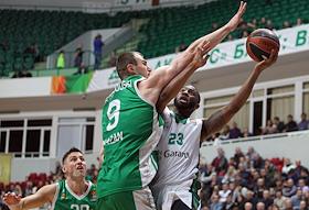 Евролига 2016/2017. Баскетбол. 3-й тур. Матч между командами "УНИКС" (Казань, Россия) и "Дарушшафака" (Стамбул, Турция). Игрок БК "Уникс" Артем Параховский (справа) и игрок турецкой команды "Дарушшафака" Уилл Клайберн (слева) во время матча на спортивной арене "Баскет-Холл".