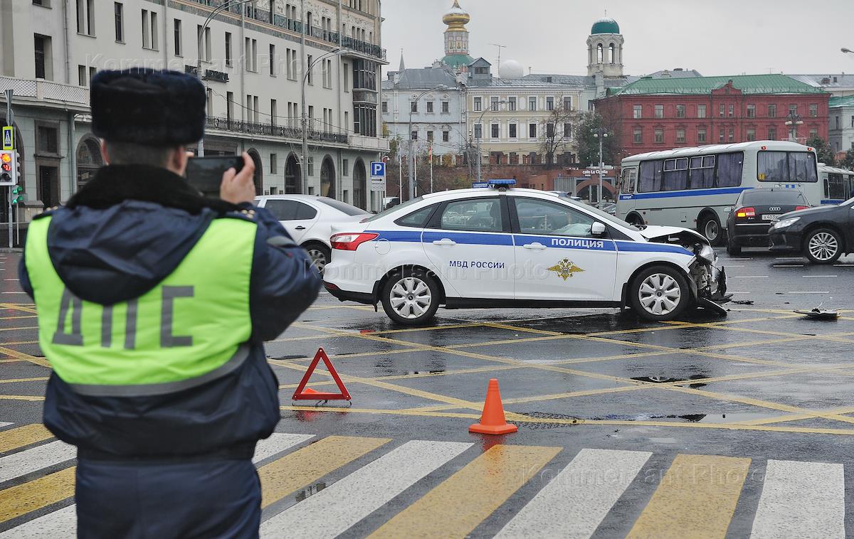 Жанровая фотография. Последствия дорожно-транспортного происшествия с полицейским автомобилем.