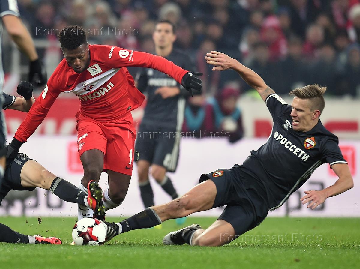 Чемпионат России по футболу. Премьер-лига. 12-й тур. Матч между командами "Спартак" (Москва) - "ЦСКА" (Москва). Игрок команды "Спартак" Квинси Промес (справа) и игрок команды ЦСКА Георгий Щеников (слева) во время матча.