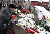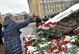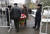Митинг в День памяти жертв политических репрессий. Участники митинга у памятника жертвам репрессий "Соловецкий камень" вносят корзину цветов к памятнику.