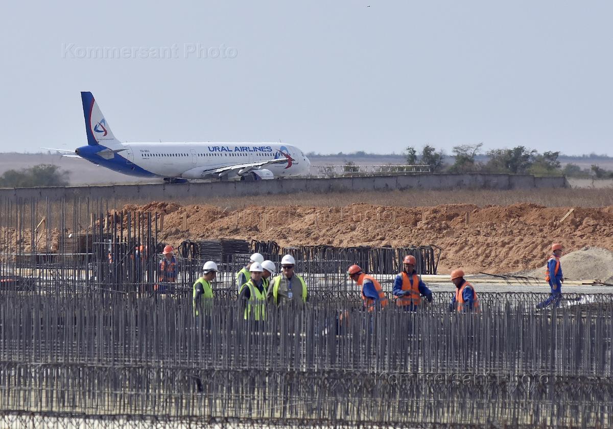 Глава Республики Крым Сергей Аксенов во время посещения строительства нового аэровокзального комплекса международного аэропорта "Симферополь". Рабочие завершили выемку грунта и приступили к устройству фундаментной плиты основного здания комплекса.