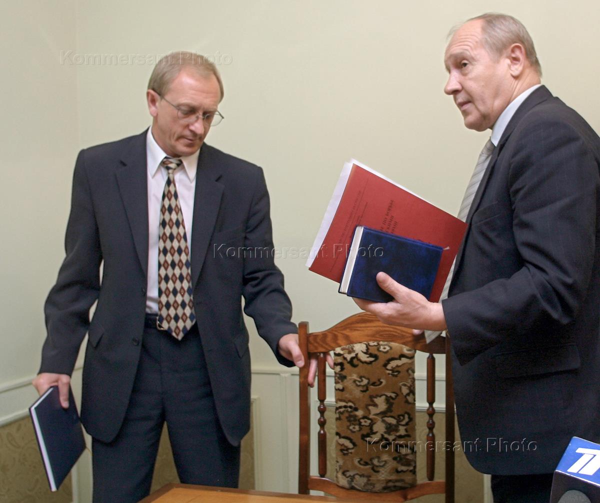 The acting head of the Russian Interior Affairs Ministry tax evasion and economic crimes investigation department Anatoly Gulkov (right) and his deputy Alexander Scheglov (left) attend the briefing "The work of the tax evasion and economic crimes investigation department on preventing crimes in energy industry".