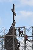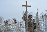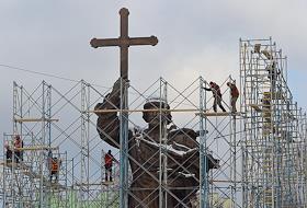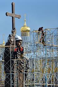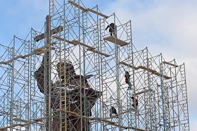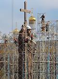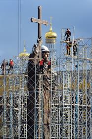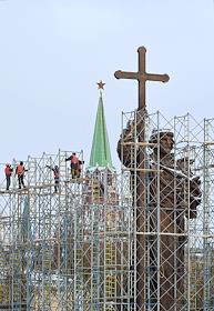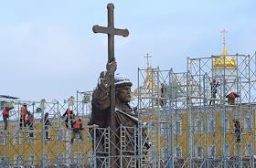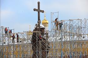 Памятник князю Владимиру работы скульптора Салавата Щербакова на Боровицкой площади в строительных лесах после установки.